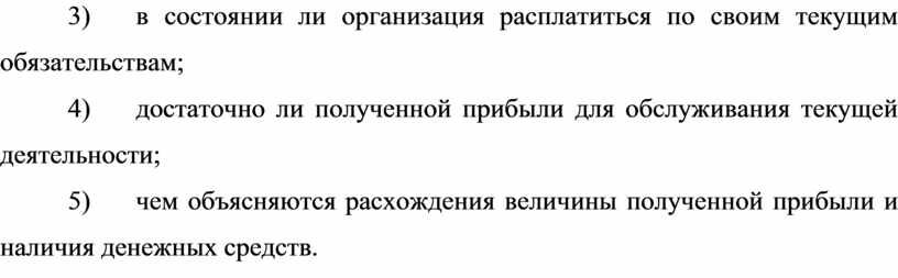 5) чем объясняются расхождения величины полученной прибыли и наличия денежных средств.
