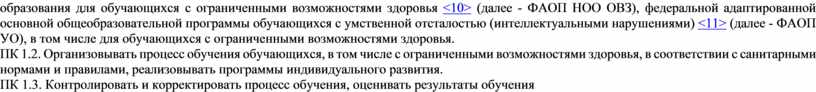 ПК 1.1. Проектировать процесс обучения на основе федерального государственного образовательного стандарта начального общего образования <6> (далее - ФГОС НОО), федерального государственного образовательного стандарта начального общего образования обучающихся с ограниченными возможностями здоровья <7> (далее - ФГОС НОО ОВЗ), федерального государственного образовательного стандарта образования обучающихся с умственной отсталостью (интеллектуальными нарушениями) <8> (далее - ФГОС УО), федеральной образовательной программы начального общего образования <9> (далее - ФОП НОО), федеральной адаптированной образовательной программы начального общего образования для обучающихся с ограниченными возможностями здоровья <10> (далее - ФАОП НОО ОВЗ), федеральной адаптированной основной общеобразовательной программы обучающихся с умственной отсталостью (интеллектуальными нарушениями) <11> (далее - ФАОП УО), в том числе для обучающихся с ограниченными возможностями здоровья.