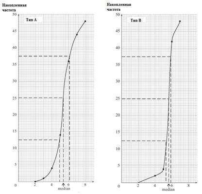 №3. а) Медиана (тип А) 5,6; Медиана (тип В) 5,8.