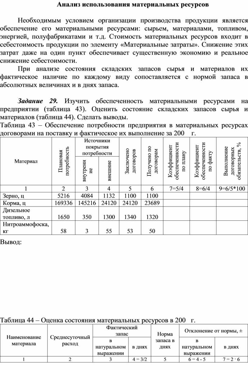 Задание 29. Изучить обеспеченность материальными ресурсами на предприятии (таблица 43). Оценить состояние складских запасов сырья и материалов (таблица 44). Сделать выводы.