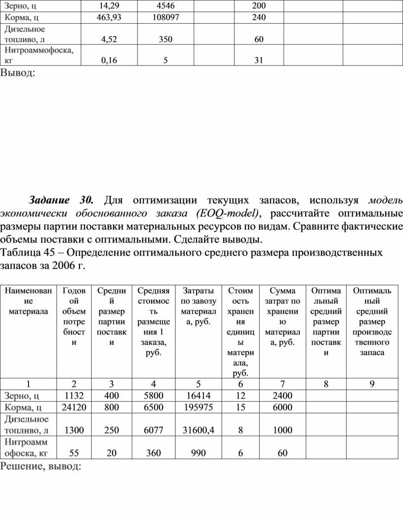 Задание 30. Для оптимизации текущих запасов, используя модель экономически обоснованного заказа (EOQ-model), рассчитайте оптимальные размеры партии поставки материальных ресурсов по видам. Сравните фактические объемы поставки с оптимальными. Сделайте выводы.