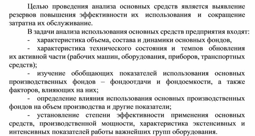 Целью проведения анализа основных средств является выявление резервов повышения эффективности их использования и сокращение затрат на их обслуживание.