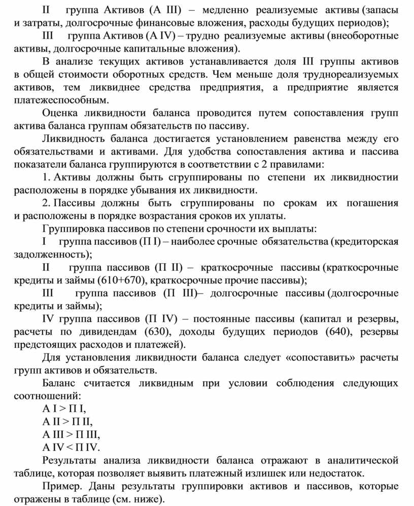 Баланс считается ликвидным при условии соблюдения следующих соотношений: