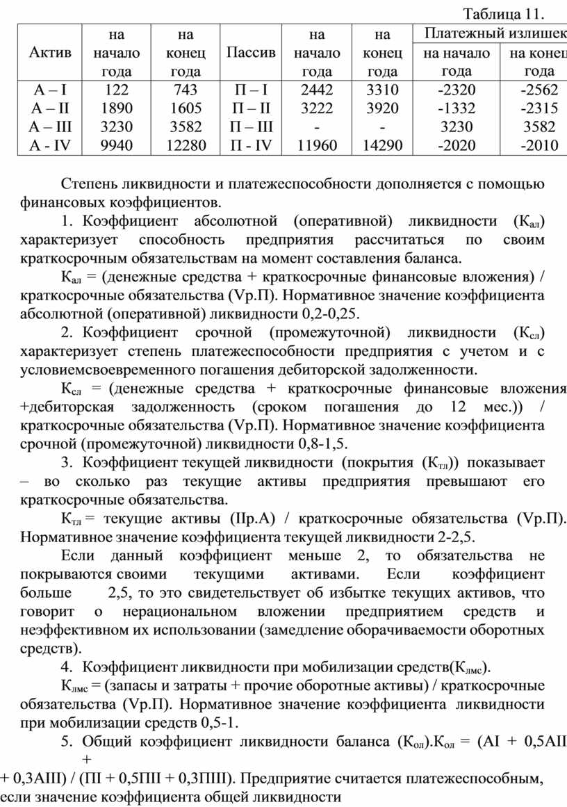 + 0,3АIII) / (ПI + 0,5ПII + 0,3ПIII). Предприятие считается платежеспособным, если значение коэффициента общей ликвидности баланса равно 1.