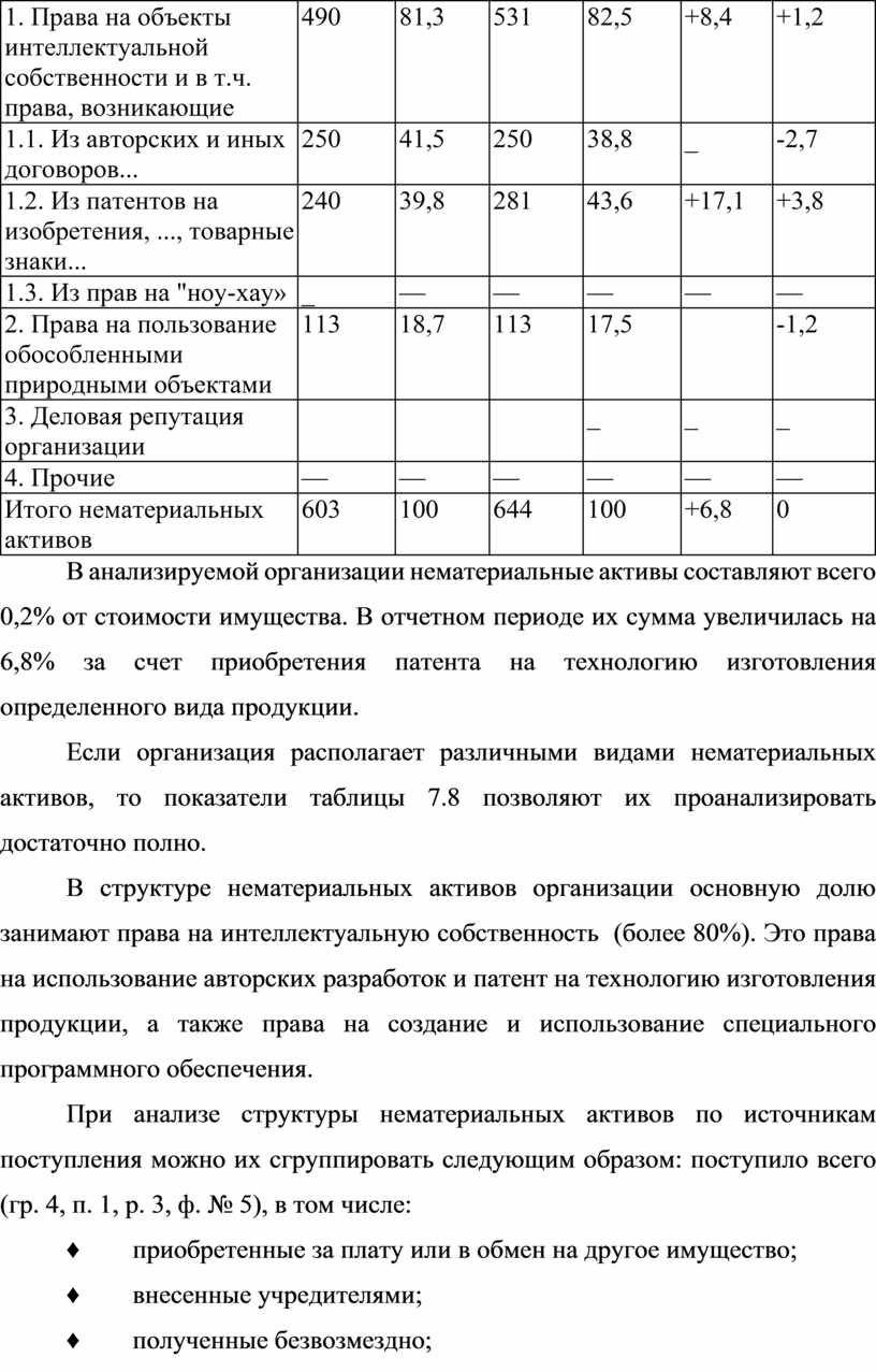 Если организация располагает различными видами нематериальных активов, то показатели таблицы 7.8 позволяют их проанализировать достаточно полно.