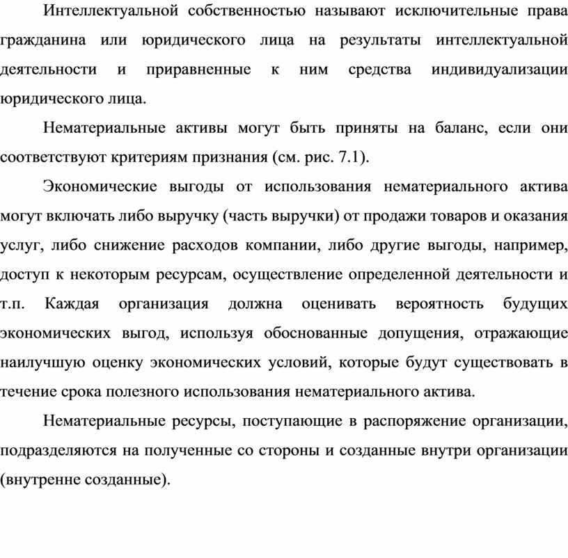 Нематериальные активы — это часть имущества организации, представляющая собой идентифицируемый, неденежный актив, не имеющий физической формы, который используется в производстве или при предоставлении товаров или услуг, для сдачи в аренду другим сторонам или в административных целях.