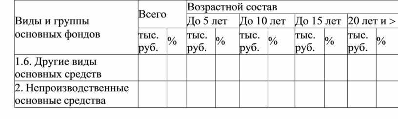 Возрастная структура основных фондов характеризует их распределение по возрастным группам: до 5 лет; от 5 до 10 лет; от 10 до 15 лет; от 15 до 20 лет и свыше 20 лет.