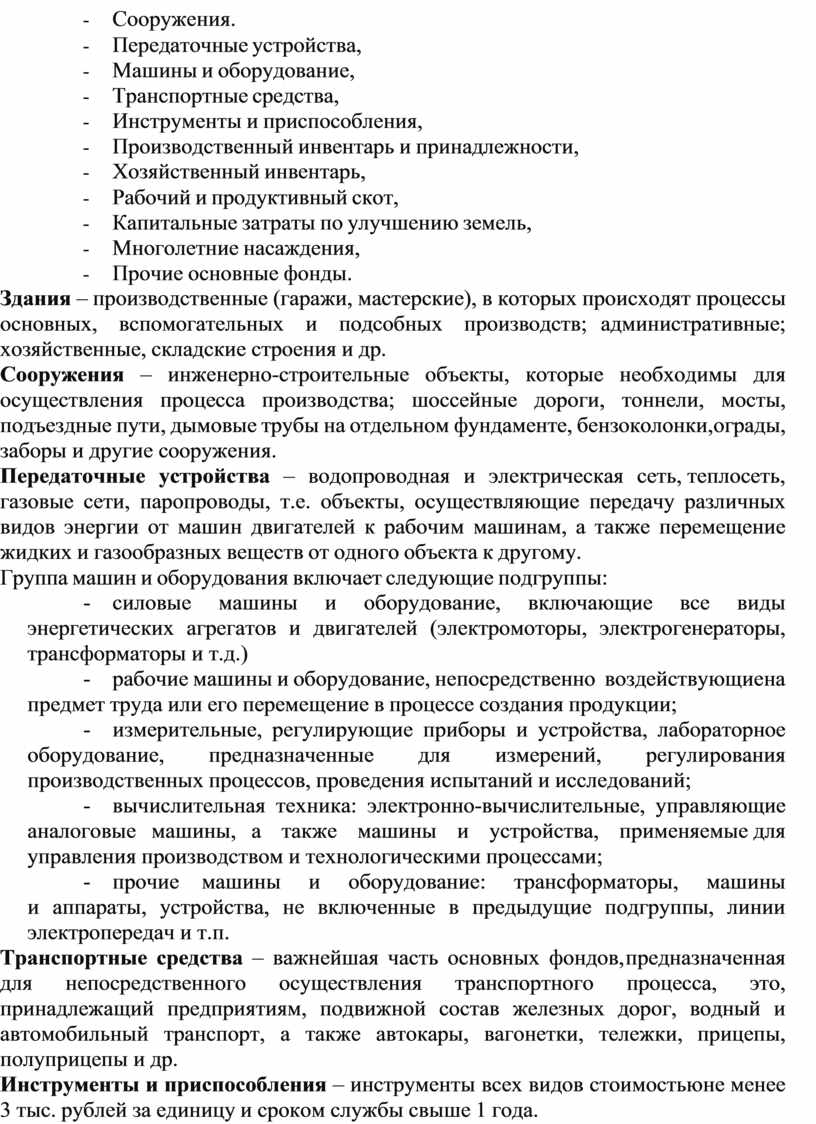 В соответствии со сроком службы и назначением в производственном процессе основные производственные фонды предприятий подразделяются на следующие группы и виды: