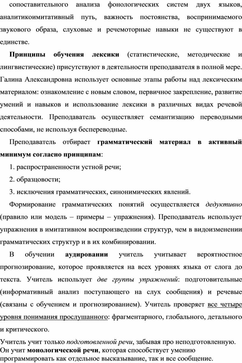 Принципы обучения лексики (статистические, методические и лингвистические) присутствуют в деятельности преподавателя в полной мере. Галина Александровна использует основные этапы работы над лексическим материалом: ознакомление с новым словом, первичное закрепление, развитие умений и навыков и использование лексики в различных видах речевой деятельности. Преподаватель осуществляет семантизацию переводными способами, не используя беспереводные.