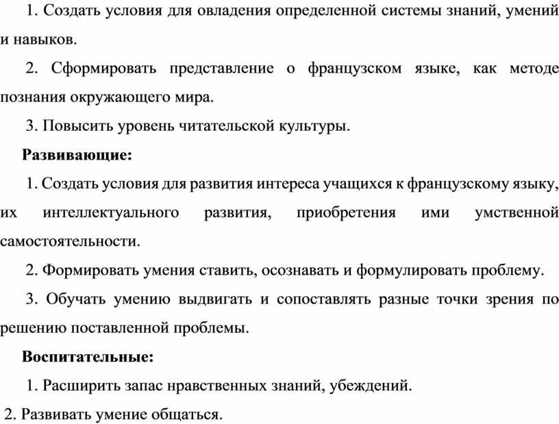 1. Создать условия для развития интереса учащихся к французскому языку, их интеллектуального развития, приобретения ими умственной самостоятельности.