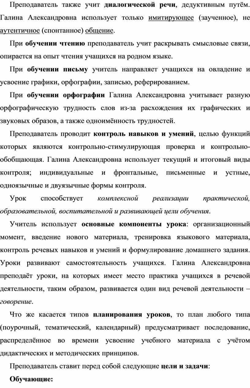 Учитель учит только подготовленной речи, забывая про неподготовленную. Он учит монологической речи, которая способствует умению программировать как отдельное высказывание, так и все сообщение. Преподаватель также учит диалогической речи, дедуктивным путём. Галина Александровна использует только имитирующее (заученное), не аутентичное (спонтанное) общение.