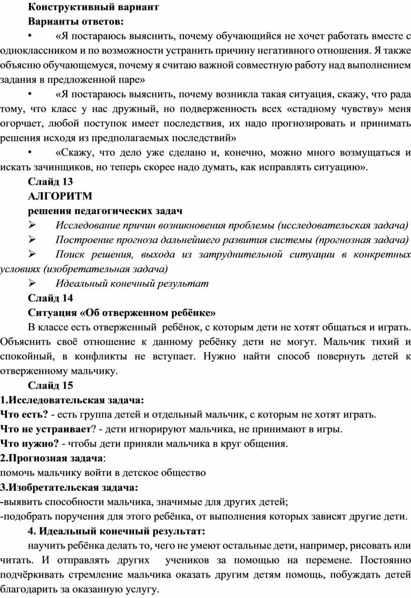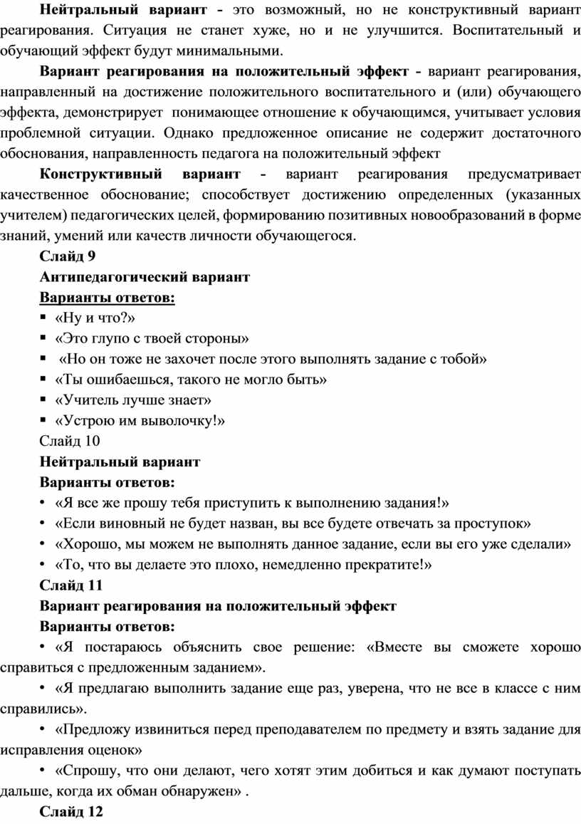 Конструктивный вариант - вариант реагирования предусматривает качественное обоснование; способствует достижению определенных (указанных учителем) педагогических целей, формированию позитивных новообразований в форме знаний, умений или качеств личности обучающегося.