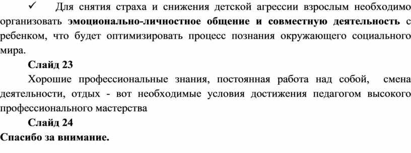 ü Для снятия страха и снижения детской агрессии взрослым необходимо организовать эмоционально-личностное общение и совместную деятельность с ребенком, что будет оптимизировать процесс познания окружающего социального мира.