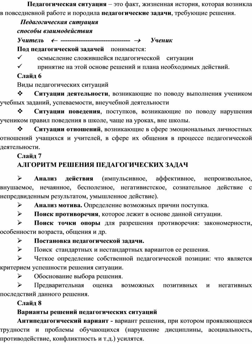 Педагогическая ситуация – это факт, жизненная история, которая возникла в повседневной работе и породила педагогические задачи, требующие решения.