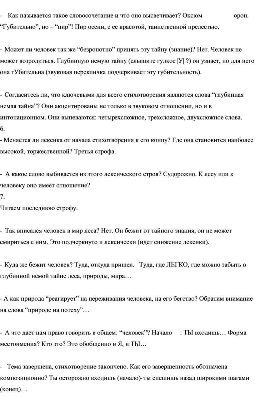 - Стихотворение называется “Лес осенью”. Можно ли его отнести к пейзажной лирике? Стихотворение философское. Оно о человеке и природе, об их взаимном проникновении (непроникновении!), об умирании и воскрешении.