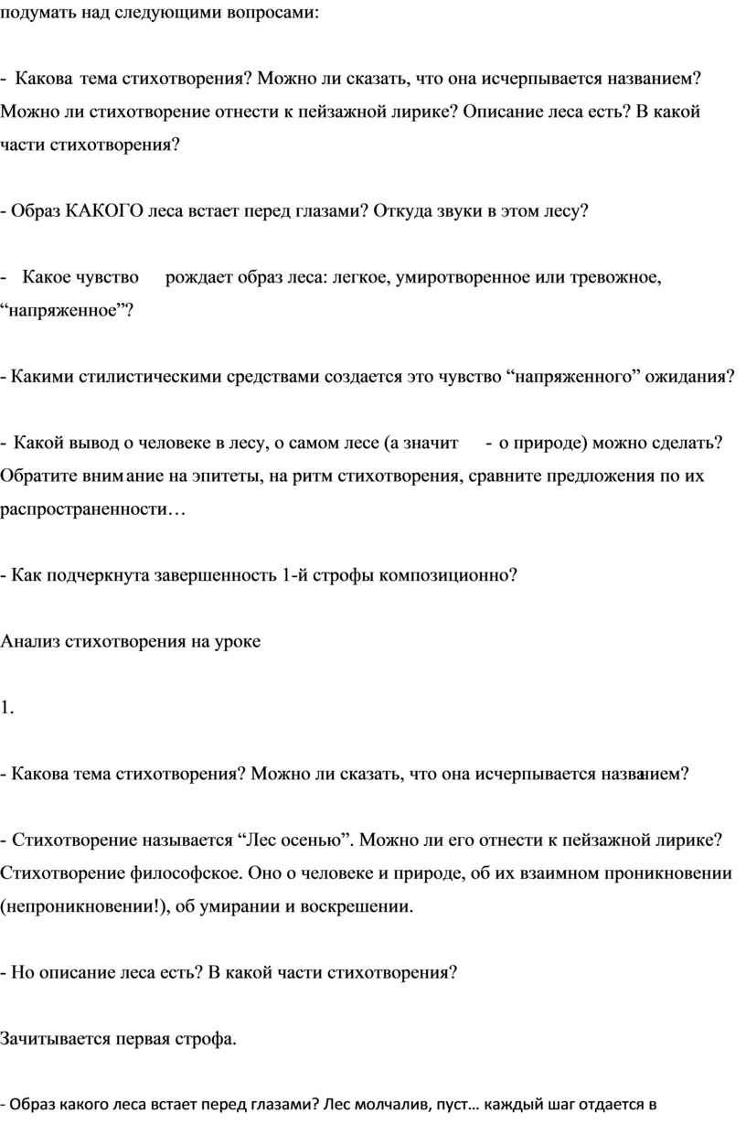 - Какова тема стихотворения? Можно ли сказать, что она исчерпывается названием? Можно ли стихотворение отнести к пейзажной лирике? Описание леса есть? В какой части стихотворения?
