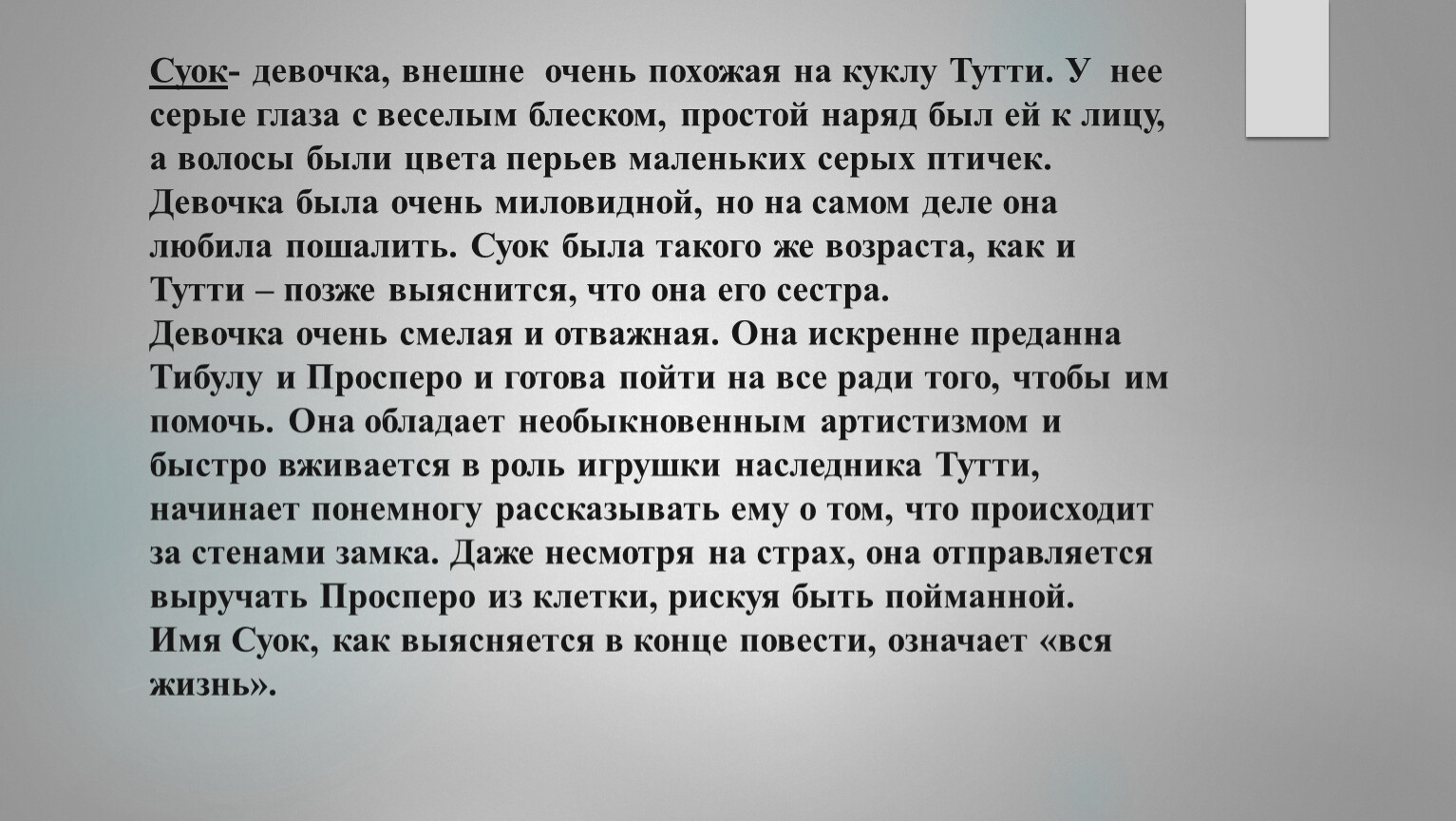 Суок- девочка, внешне очень похожая на куклу Тутти. У нее серые глаза с веселым блеском, простой наряд был ей к лицу, а волосы были цвета перьев маленьких серых птичек. Девочка была очень миловидной, но на самом деле она любила пошалить. Суок была такого же возраста, как и Тутти – позже выяснится, что она его сестра.