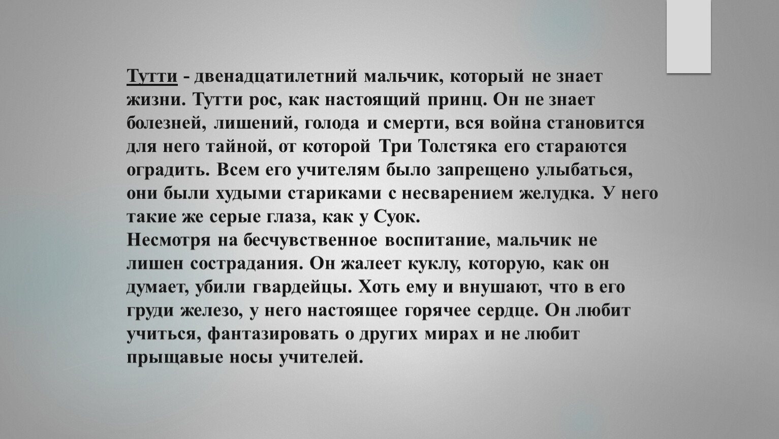 Тутти - двенадцатилетний мальчик, который не знает жизни. Тутти рос, как настоящий принц. Он не знает болезней, лишений, голода и смерти, вся война становится для него тайной, от которой Три Толстяка его стараются оградить. Всем его учителям было запрещено улыбаться, они были худыми стариками с несварением желудка. У него такие же серые глаза, как у Суок.