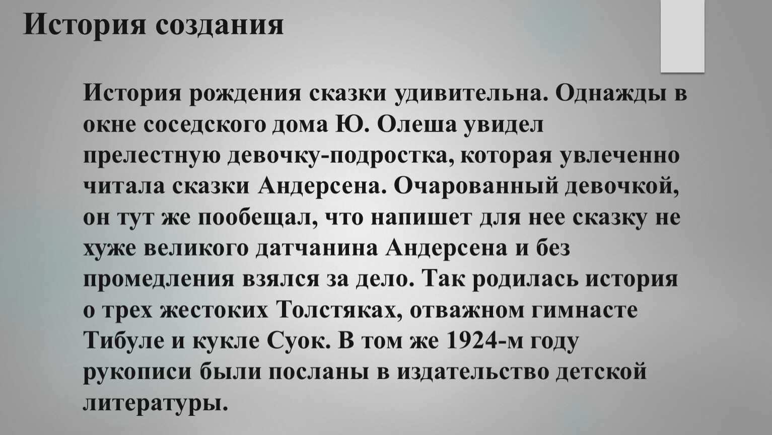 История рождения сказки удивительна. Однажды в окне соседского дома Ю. Олеша увидел прелестную девочку-подростка, которая увлеченно читала сказки Андерсена. Очарованный девочкой, он тут же пообещал, что напишет для нее сказку не хуже великого датчанина Андерсена и без промедления взялся за дело. Так родилась история о трех жестоких Толстяках, отважном гимнасте Тибуле и кукле Суок. В том же 1924-м году рукописи были посланы в издательство детской литературы.