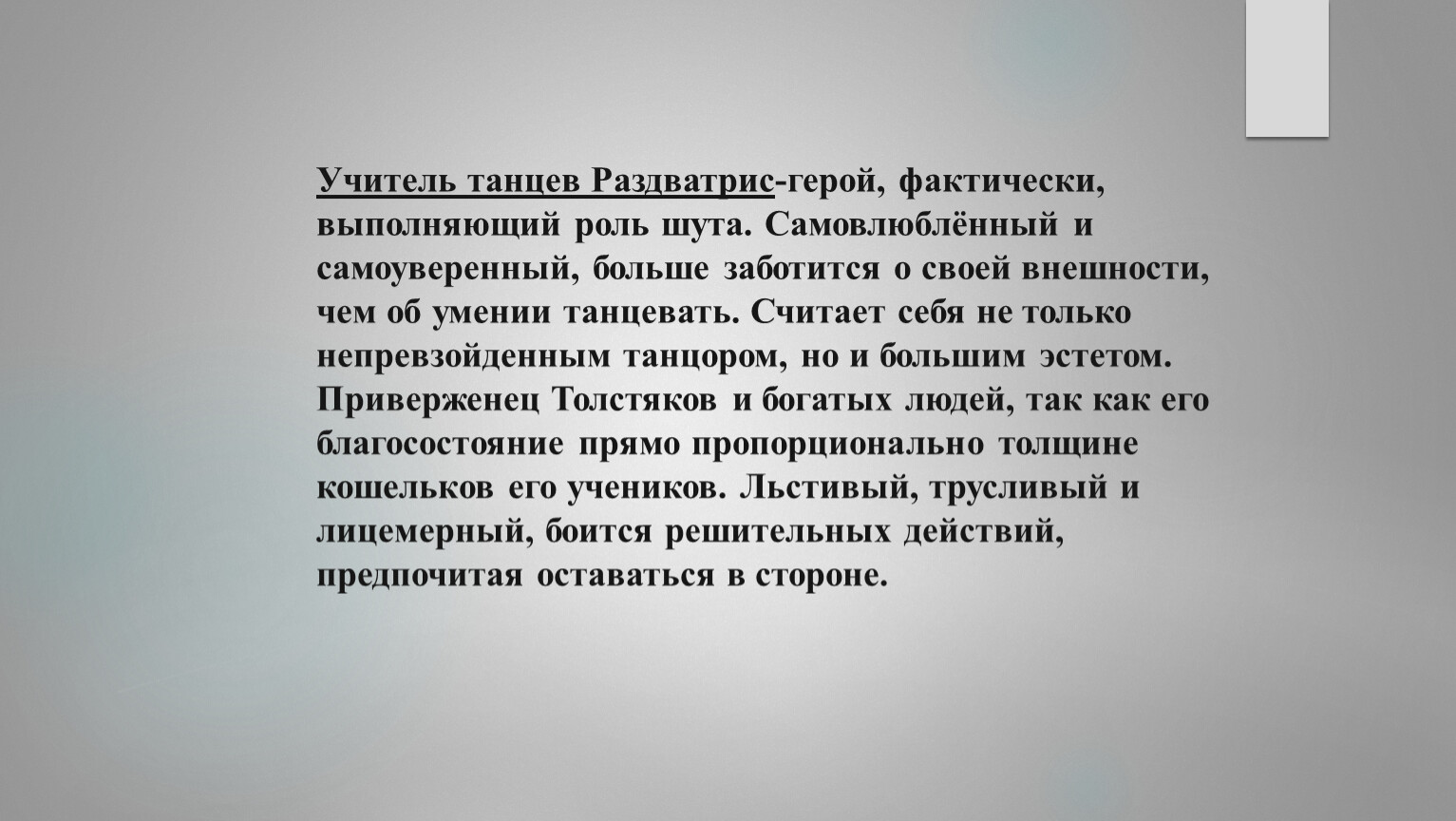 Учитель танцев Раздватрис-герой, фактически, выполняющий роль шута. Самовлюблённый и самоуверенный, больше заботится о своей внешности, чем об умении танцевать. Считает себя не только непревзойденным танцором, но и большим эстетом. Приверженец Толстяков и богатых людей, так как его благосостояние прямо пропорционально толщине кошельков его учеников. Льстивый, трусливый и лицемерный, боится решительных действий, предпочитая оставаться в стороне.