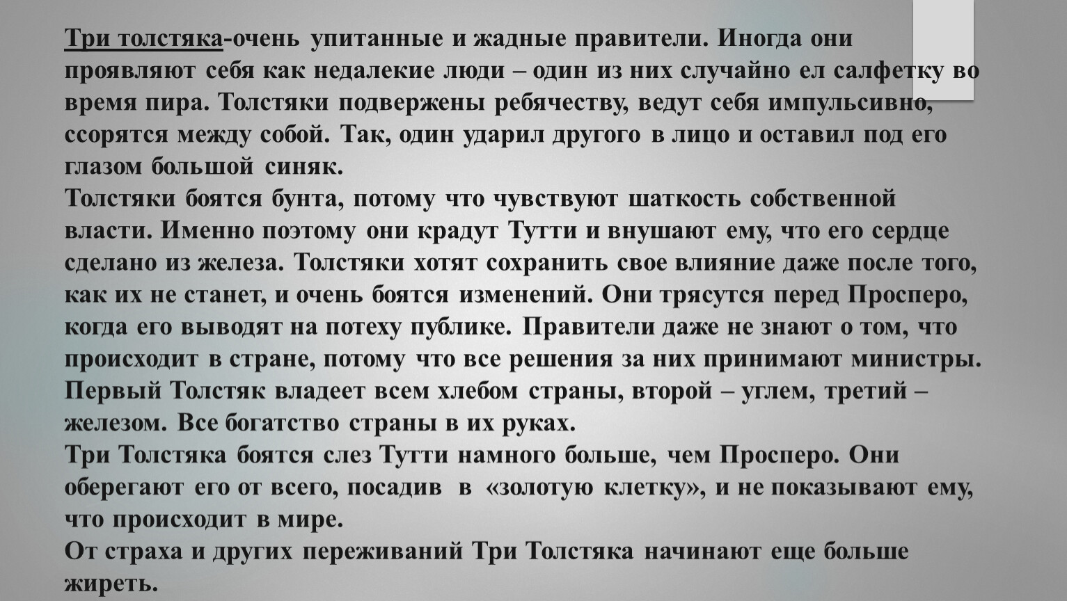 Толстяки боятся бунта, потому что чувствуют шаткость собственной власти. Именно поэтому они крадут Тутти и внушают ему, что его сердце сделано из железа. Толстяки хотят сохранить свое влияние даже после того, как их не станет, и очень боятся изменений. Они трясутся перед Просперо, когда его выводят на потеху публике. Правители даже не знают о том, что происходит в стране, потому что все решения за них принимают министры.