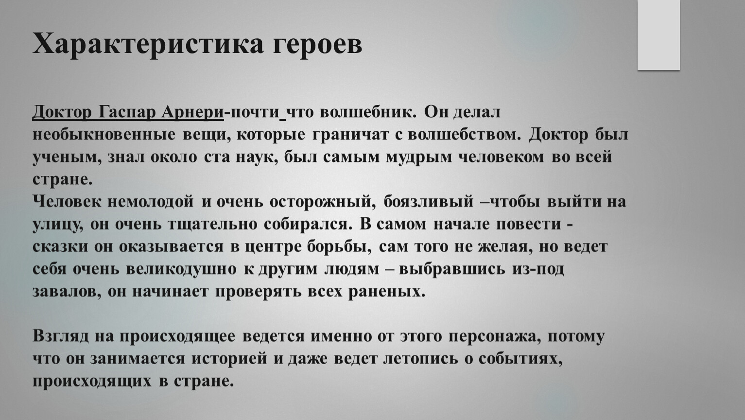 Доктор Гаспар Арнери-почти что волшебник. Он делал необыкновенные вещи, которые граничат с волшебством. Доктор был ученым, знал около ста наук, был самым мудрым человеком во всей стране.