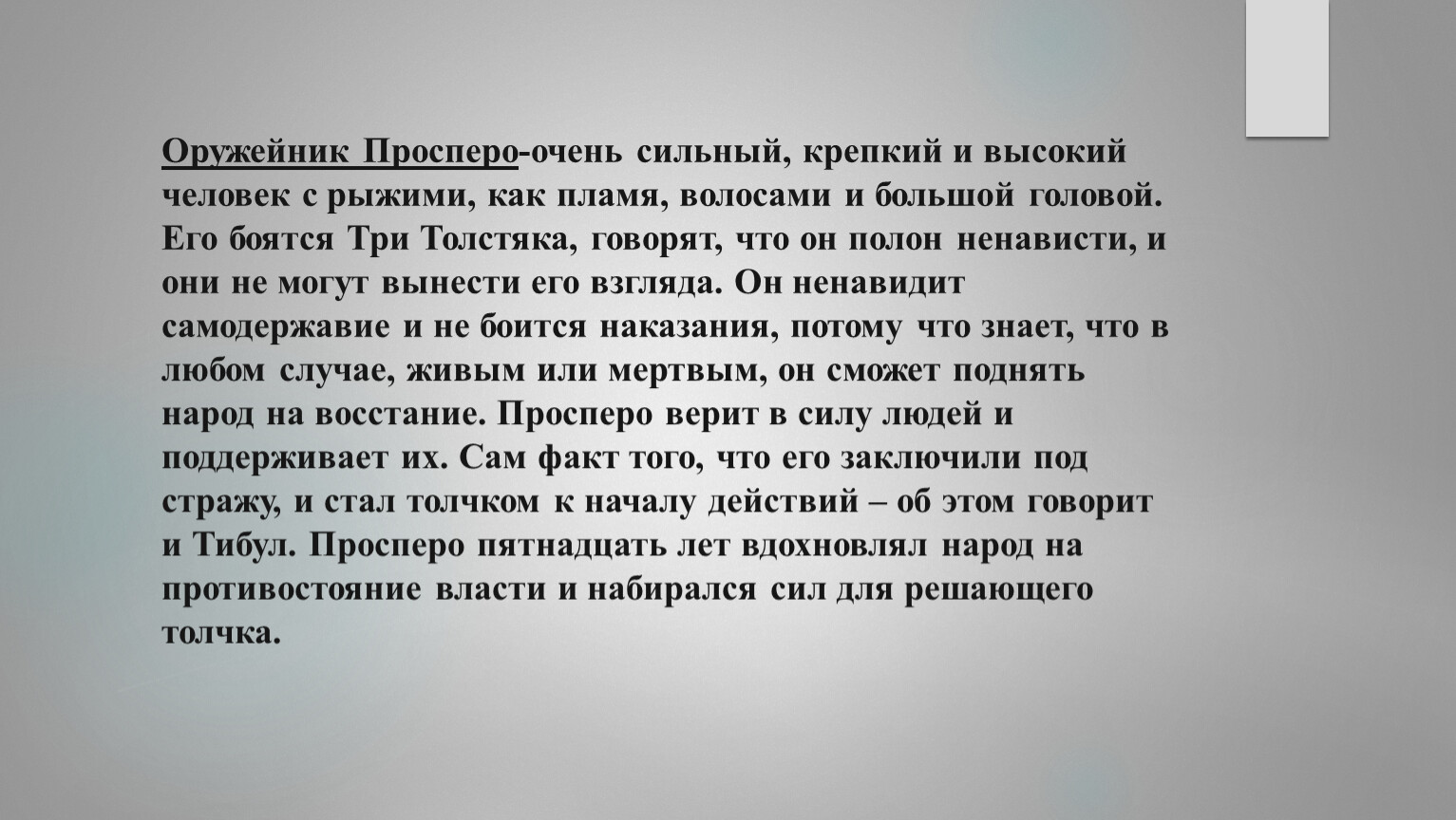 Оружейник Просперо-очень сильный, крепкий и высокий человек с рыжими, как пламя, волосами и большой головой. Его боятся Три Толстяка, говорят, что он полон ненависти, и они не могут вынести его взгляда. Он ненавидит самодержавие и не боится наказания, потому что знает, что в любом случае, живым или мертвым, он сможет поднять народ на восстание. Просперо верит в силу людей и поддерживает их. Сам факт того, что его заключили под стражу, и стал толчком к началу действий – об этом говорит и Тибул. Просперо пятнадцать лет вдохновлял народ на противостояние власти и набирался сил для решающего толчка.