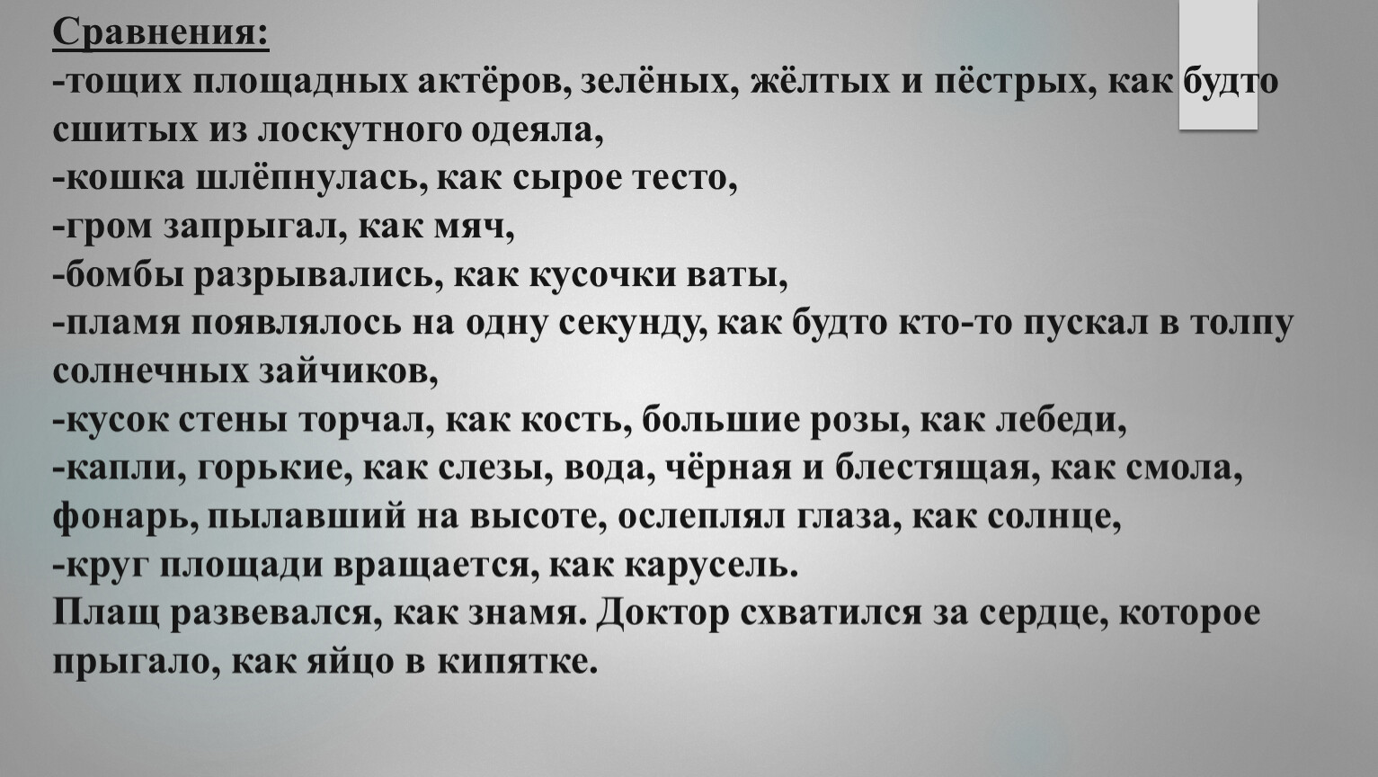 -капли, горькие, как слезы, вода, чёрная и блестящая, как смола, фонарь, пылавший на высоте, ослеплял глаза, как солнце,
