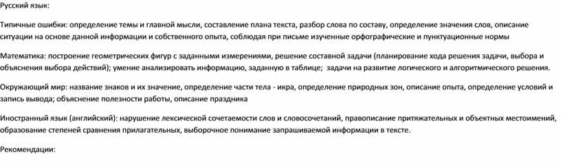 Типичные ошибки: определение темы и главной мысли, составление плана текста, разбор слова по составу, определение значения слов, описание ситуации на основе данной информации и собственного опыта, соблюдая при письме изученные орфографические и пунктуационные нормы