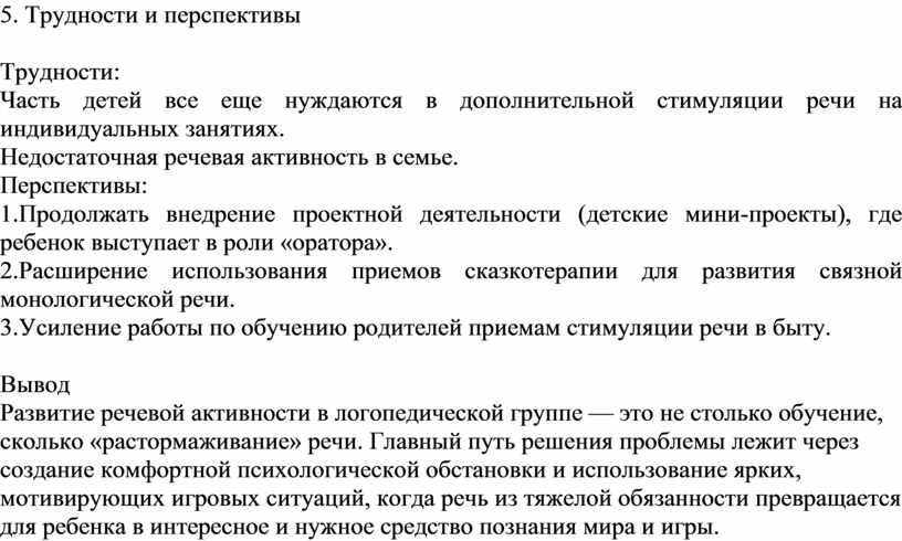 Развитие речевой активности в логопедической группе — это не столько обучение, сколько «растормаживание» речи. Главный путь решения проблемы лежит через создание комфортной психологической обстановки и использование ярких, мотивирующих игровых ситуаций, когда речь из тяжелой обязанности превращается для ребенка в интересное и нужное средство познания мира и игры.
