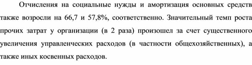 Отчисления на социальные нужды и амортизация основных средств также возросли на 66,7 и 57,8%, соответственно. Значительный темп роста прочих затрат у организации (в 2 раза) произошел за счет существенного увеличения управленческих расходов (в частности общехозяйственных), а также иных косвенных расходов.