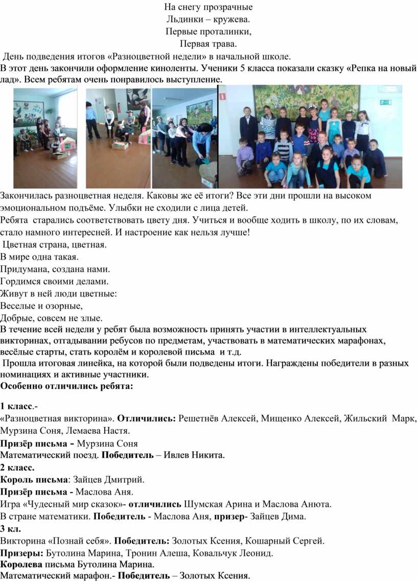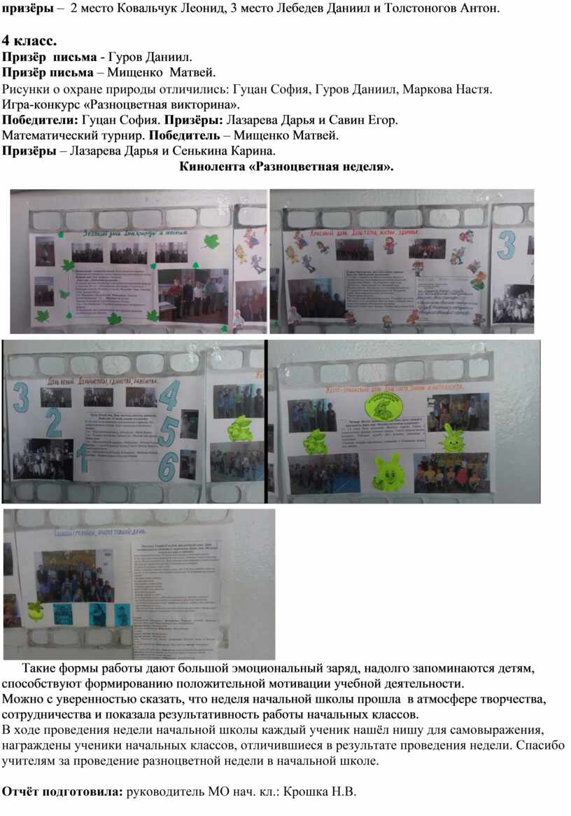 В ходе проведения недели начальной школы каждый ученик нашёл нишу для самовыражения, награждены ученики начальных классов, отличившиеся в результате проведения недели. Спасибо учителям за проведение разноцветной недели в начальной школе.