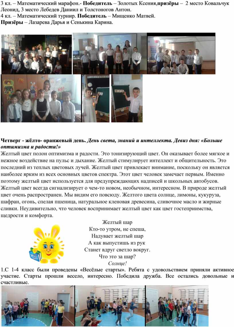 4 день-Четверг Жёлто-оранжевый день. День света, знаний и интеллекта. Девиз дня: «Больше оптимизма и радости!» План жёлто-оранжевого дня: 1. Конкурс жёлто-оранжевых нарядов 2. В 1-4 классах «Весёлые старты» 3. Выставка «Творческие идеи» 4. Конкурс историй собственного сочинения о Солнечном лучике или зайчике 5. Оформление ленты «Радуга» (всё жёлто-оранжевым цветом) |