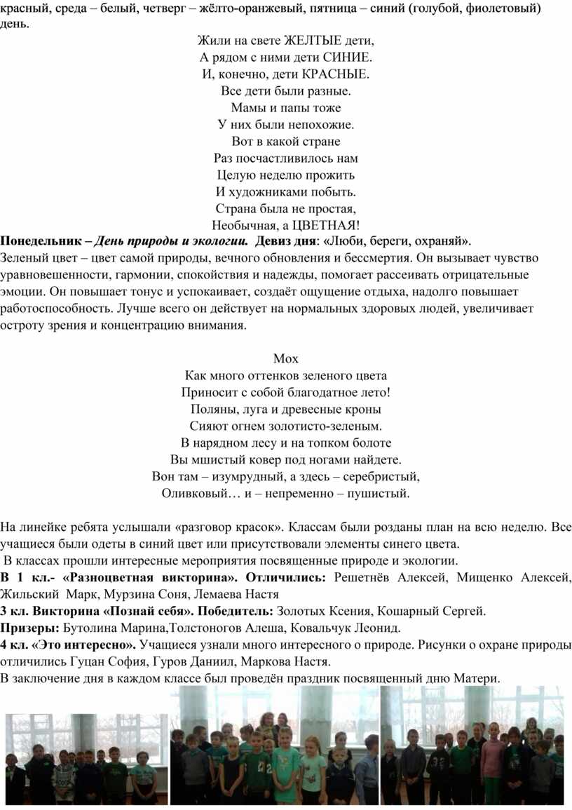 1 день-понедельник Зелёный день. День природы и экологии. Девиз дня: «Люби, береги, охраняй» 1. Линейка, посвящённая открытию разноцветной недели. 2.На переменах 1класс - «Разноцветная викторина». 2 класс – Викторина «Это интересно!» 3 класс - Викторина «Познай себя». 4 класс - «Это интересно знать» 3. Конкурс зелёных нарядов 4. Праздники для мам с 1-4 кл. 5. Оформление ленты «Радуга» (всё зелёным цветом) |