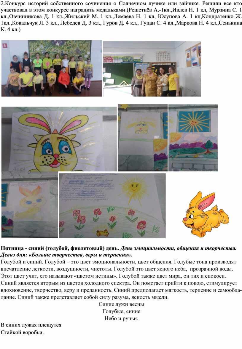 2.Конкурс историй собственного сочинения о Солнечном лучике или зайчике. Решили все кто участвовал в этом конкурсе наградить медальками (Решетнёв А.-1кл.,Ивлев Н. 1 кл, Мурзина С. 1 кл.,Овчинникова Д. 1 кл.,Жильский М. 1 кл.,Лемаева Н. 1 кл, Юсупова А. 1 кл,Кондратенко Ж. 1кл.,Ковальчук Л. 3 кл., Лебедев Д. 3 кл., Гуров Д. 4 кл., Гуцан С. 4 кл.,Маркова Н. 4 кл.,Сенькина К. 4 кл.)