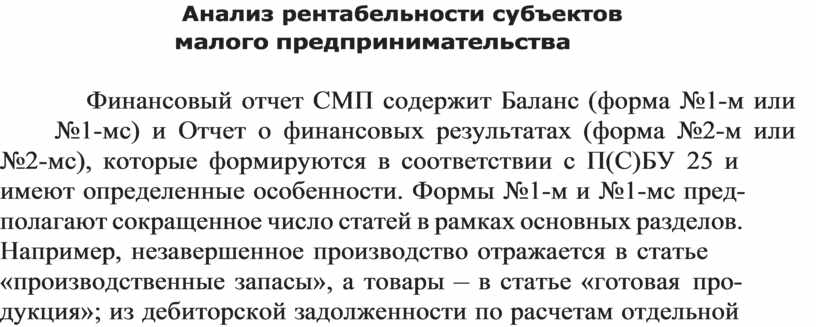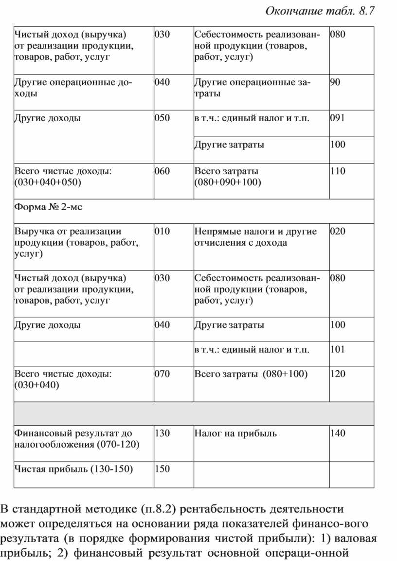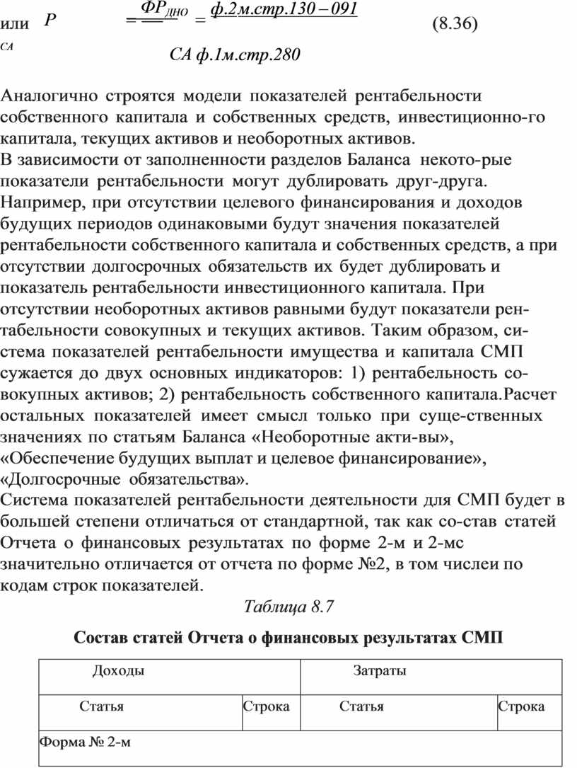 Система показателей рентабельности деятельности для СМП будет в большей степени отличаться от стандартной, так как со- став статей Отчета о финансовых результатах по форме 2-м и 2-мс значительно отличается от отчета по форме №2, в том числе и по кодам строк показателей.