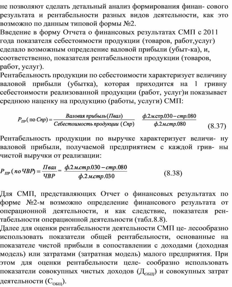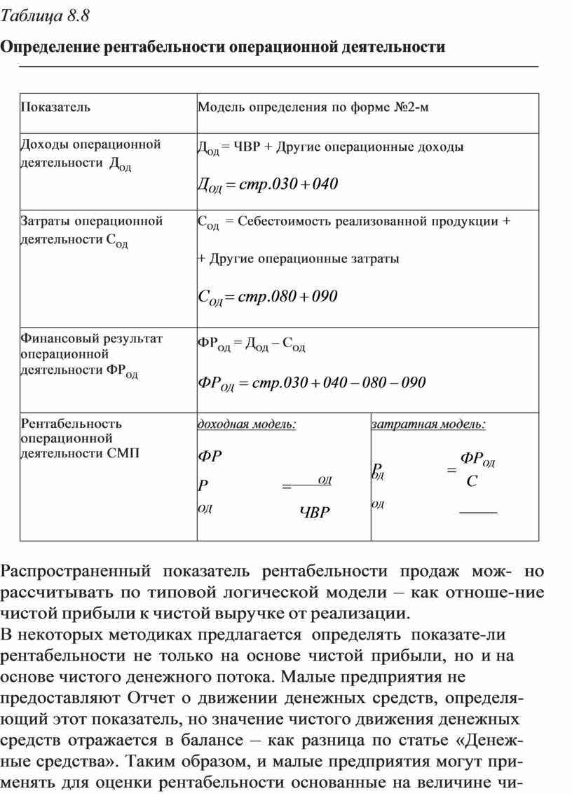 Для СМП, представляющих Отчет о финансовых результатах по форме №2-м возможно определение финансового результата от операционной деятельности, и как следствие, показателя рен- табельности операционной деятельности (табл.8.8).