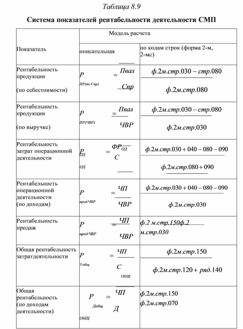 Если в числителе моделей расчета показателей рентабельно- сти имущества и капитала СМП используется величина чистой прибыли, система показателей рентабельности не отличается от представленной в п.8.2.