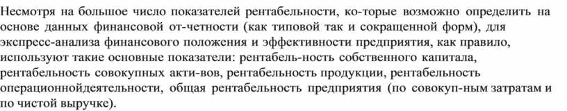 Несмотря на большое число показателей рентабельности, ко- торые возможно определить на основе данных финансовой от- четности (как типовой так и сокращенной форм), для экспресс- анализа финансового положения и эффективности предприятия, как правило, используют такие основные показатели: рентабель- ность собственного капитала, рентабельность совокупных акти- вов, рентабельность продукции, рентабельность операционной деятельности, общая рентабельность предприятия (по совокуп- ным затратам и по чистой выручке).