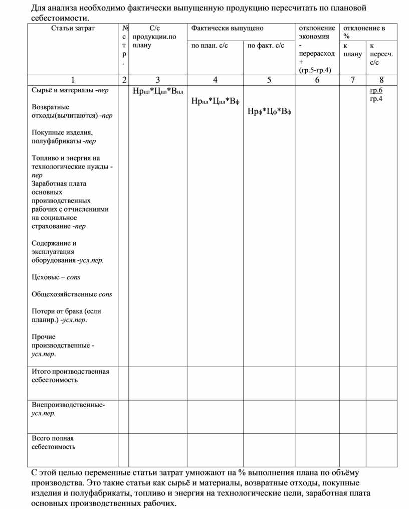 С этой целью переменные статьи затрат умножают на % выполнения плана по объёму производства. Это такие статьи как сырьё и материалы, возвратные отходы, покупные изделия и полуфабрикаты, топливо и энергия на технологические цели, заработная плата основных производственных рабочих.