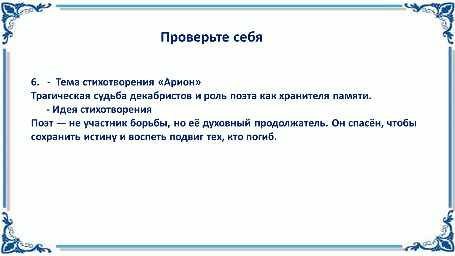 Почему Арион оказался в море? | Бросился в море, спасаясь от убийства, после исполнения песни | Выброшен бурей — символ исторической катастрофы (декабристское восстание) |
