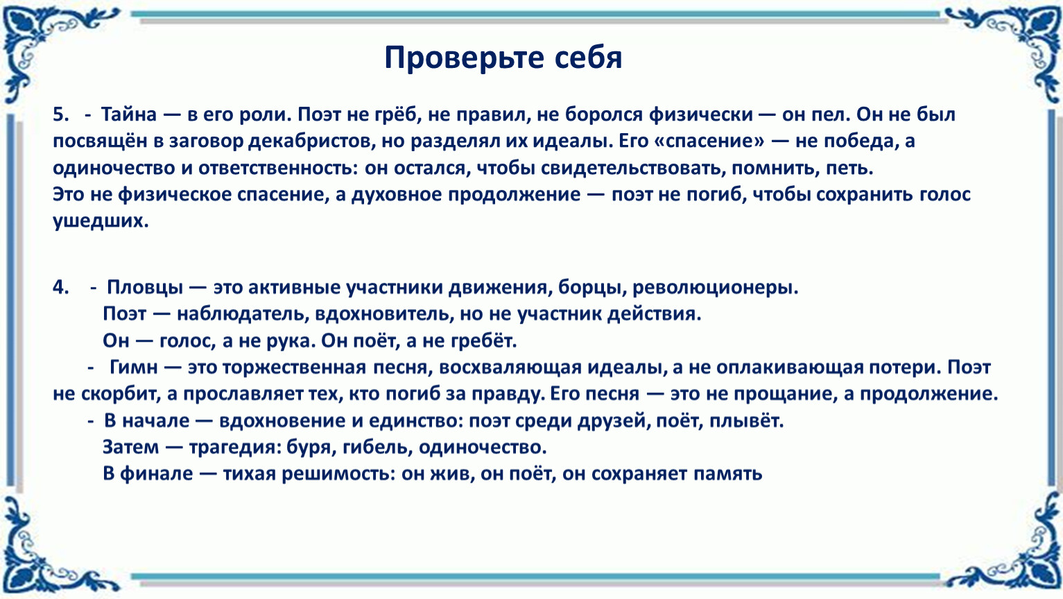 5. - Тайна — в его роли. Поэт не грёб, не правил, не боролся физически — он пел. Он не был посвящён в заговор декабристов, но разделял их идеалы. Его «спасение» — не победа, а одиночество и ответственность: он остался, чтобы свидетельствовать, помнить, петь.