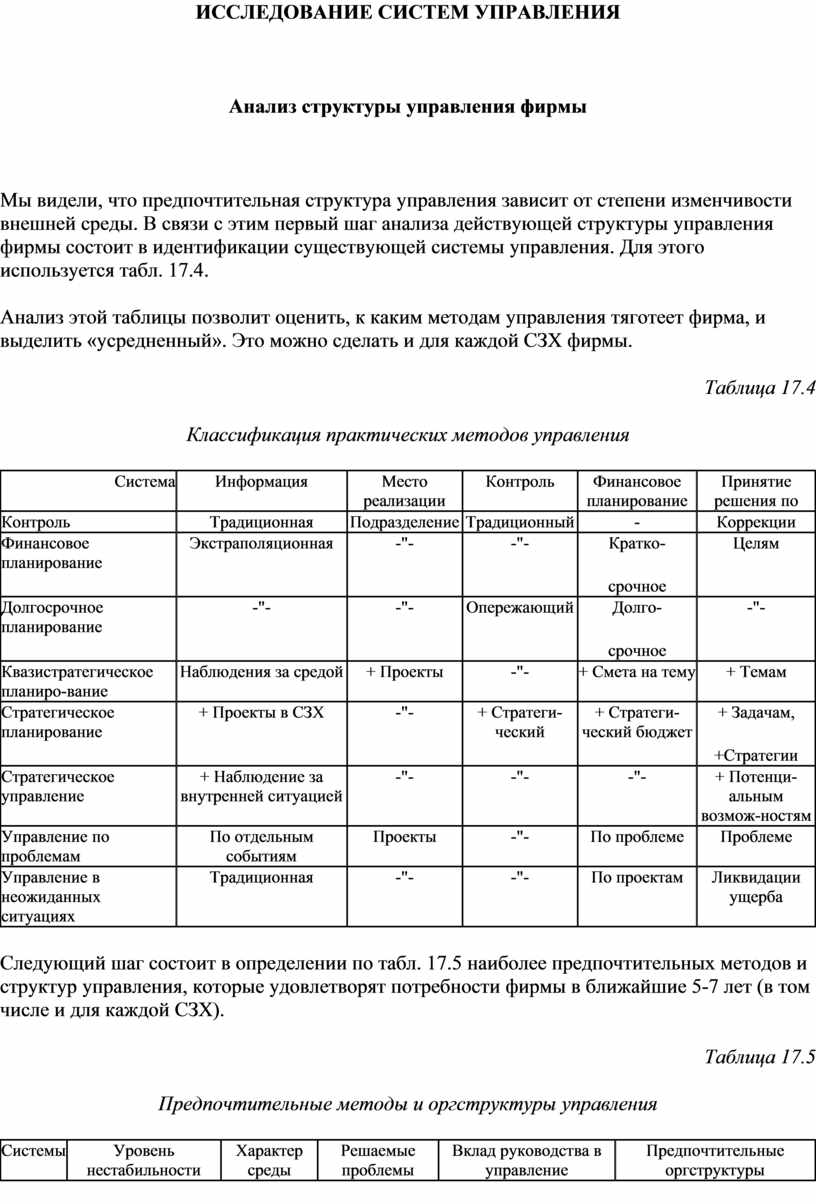 Следующий шаг состоит в определении по табл. 17.5 наиболее предпочтительных методов и структур управления, которые удовлетворят потребности фирмы в ближайшие 5-7 лет (в том числе и для каждой СЗХ).