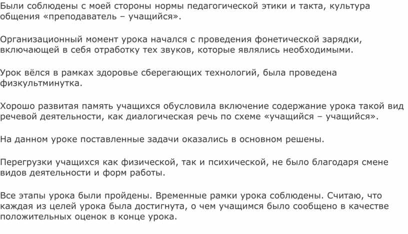 Все этапы урока были пройдены. Временные рамки урока соблюдены. Считаю, что каждая из целей урока была достигнута, о чем учащимся было сообщено в качестве положительных оценок в конце урока.