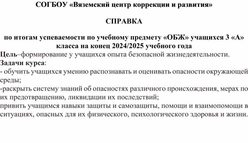 по итогам успеваемости по учебному предмету «ОБЖ» учащихся 3 «А» класса на конец 2024/2025 учебного года