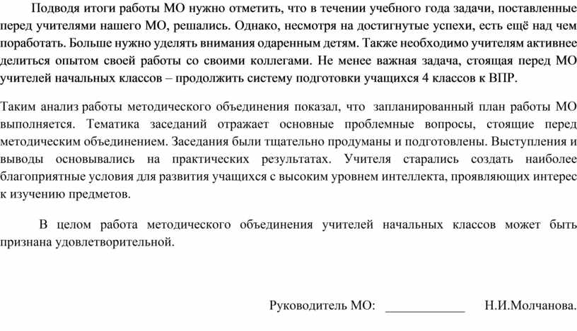 Подводя итоги работы МО нужно отметить, что в течении учебного года задачи, поставленные перед учителями нашего МО, решались. Однако, несмотря на достигнутые успехи, есть ещё над чем поработать. Больше нужно уделять внимания одаренным детям. Также необходимо учителям активнее делиться опытом своей работы со своими коллегами. Не менее важная задача, стоящая перед МО учителей начальных классов – продолжить систему подготовки учащихся 4 классов к ВПР.