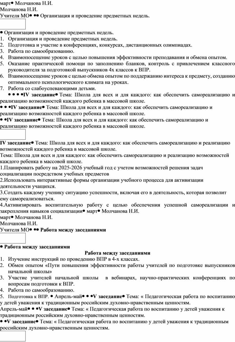 1. Организация и проведение предметных недель. 2. Подготовка и участие в конференциях, конкурсах, дистанционных олимпиадах. 3. Работа по самообразованию. 4. Взаимопосещение уроков с целью повышения эффективности преподавания и обмена опытом. 5. Оказание практической помощи по заполнению бланков, контроль с привлечением классного руководителя за подготовкой выпускников 4х классов к ВПР. 6. Взаимопосещение уроков с целью обмена опытом по поддержанию интереса к предмету, созданию оптимального психологического климата на уроках. 7. Работа со слабоуспевающими детьми.