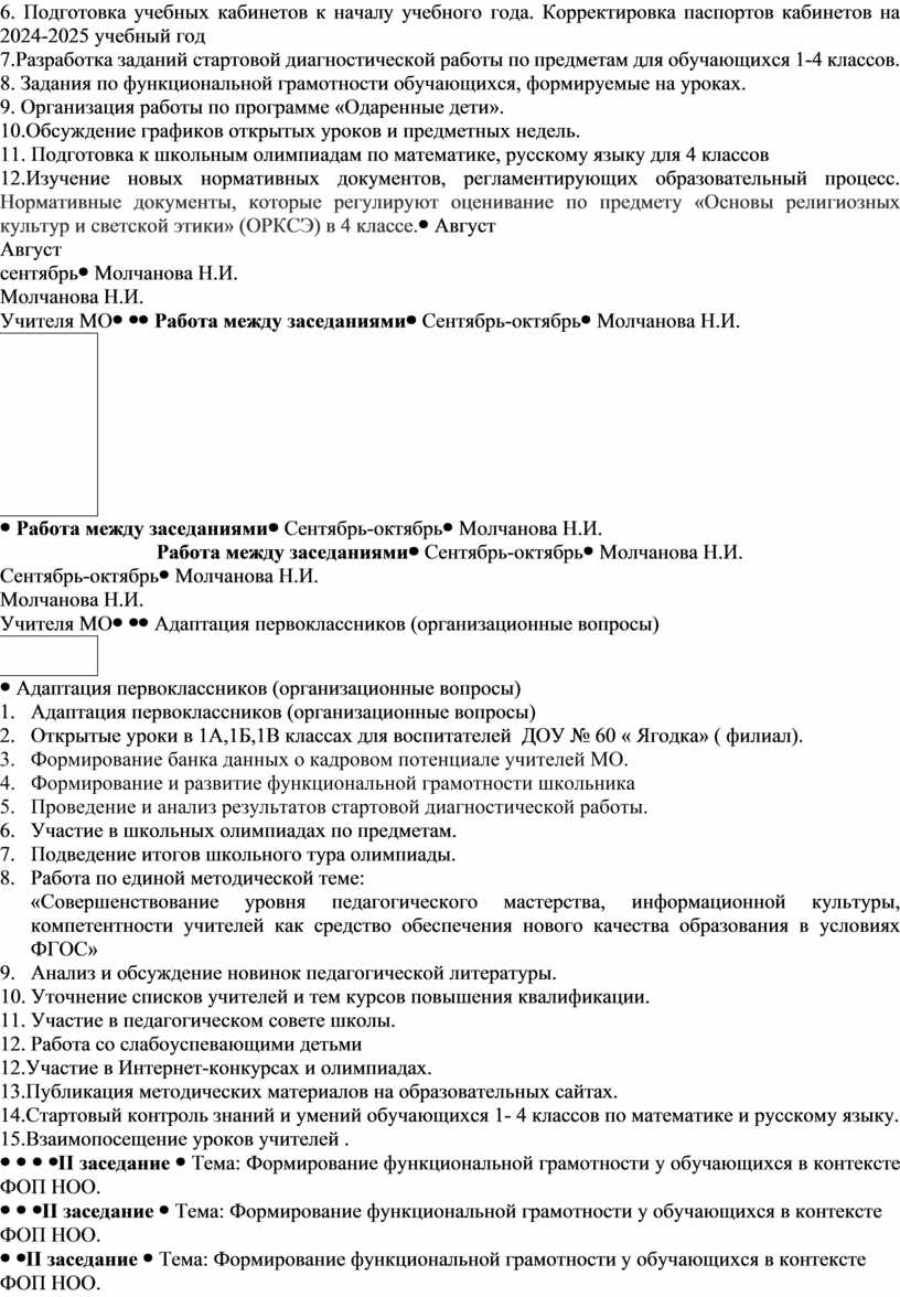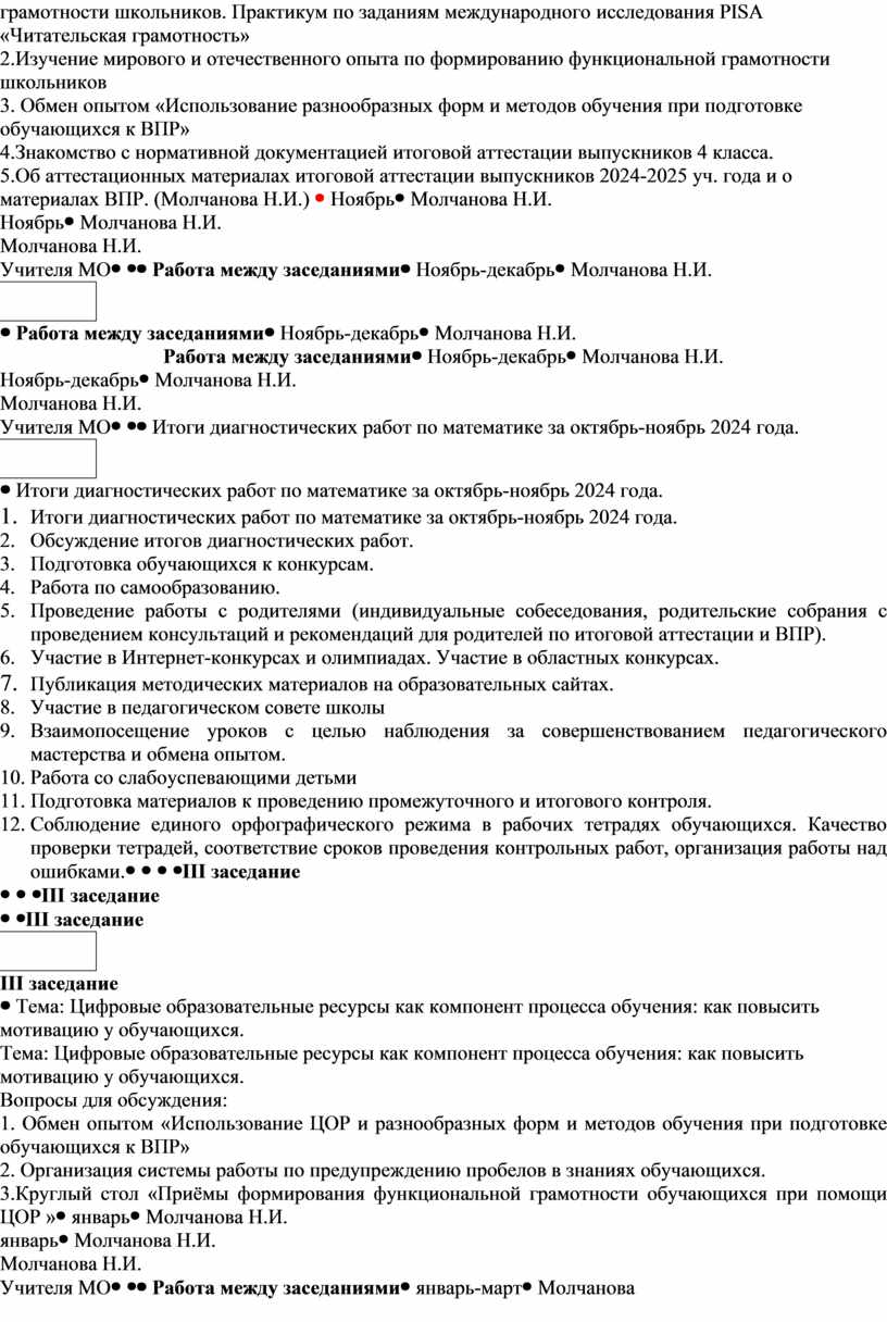 Тема: Формирование функциональной грамотности у обучающихся в контексте ФОП НОО. Форма проведения: круглый стол. Вопросы для обсуждения: 1.Изучение критериев оценивания функциональной грамотности школьников. Практикум по заданиям международного исследования РISA «Читательская грамотность» 2.Изучение мирового и отечественного опыта по формированию функциональной грамотности школьников 3. Обмен опытом «Использование разнообразных форм и методов обучения при подготовке обучающихся к ВПР» 4.Знакомство с нормативной документацией итоговой аттестации выпускников 4 класса. 5.Об аттестационных материалах итоговой аттестации выпускников 2024-2025 уч. года и о материалах ВПР. (Молчанова Н.И.) |