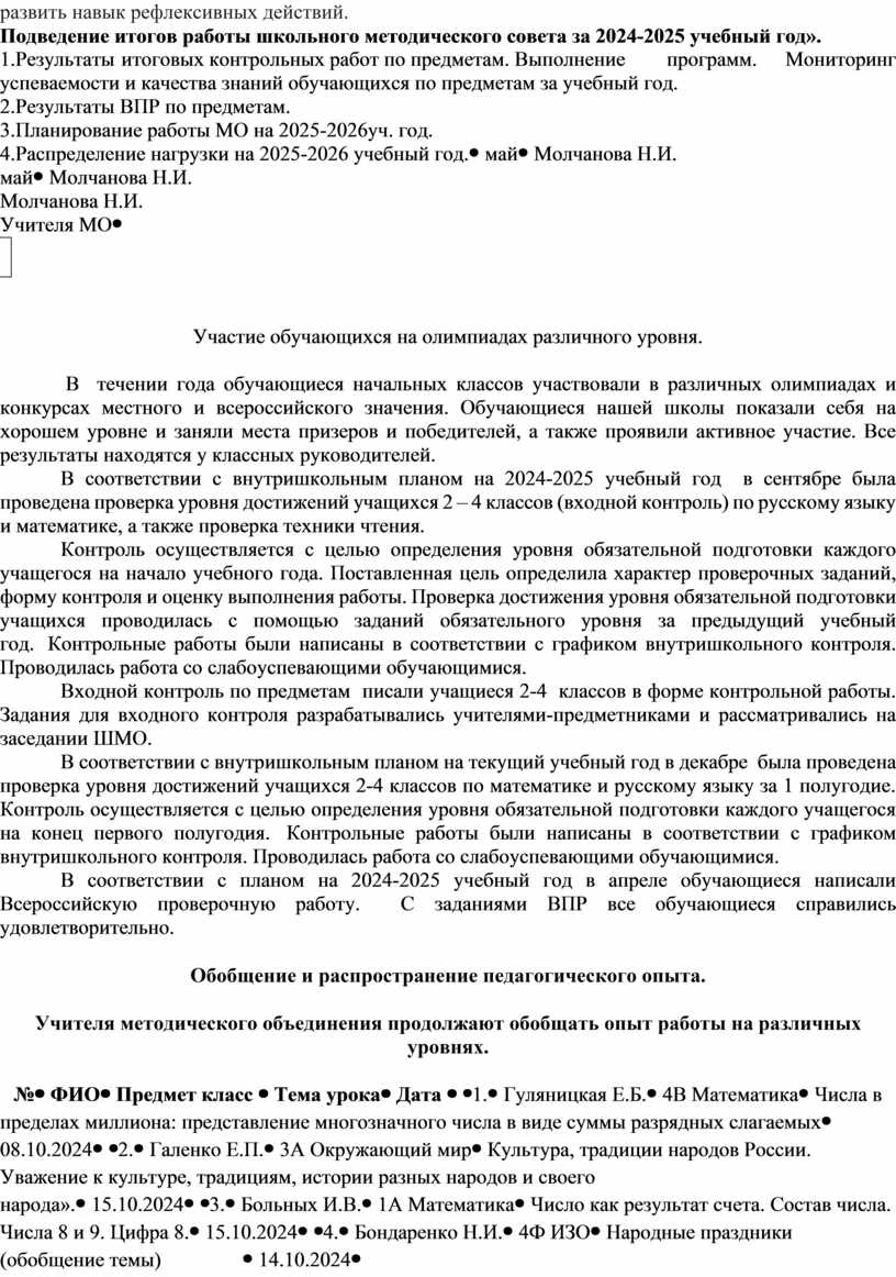 Тема: « Педагогическая работа по воспитанию у детей уважения к традиционным российским духовно-нравственным ценностям. Вопросы для обсуждения: 1. формирование у учащихся начальных классов умение ориентироваться в новой социальной среде; 2.формировать положительную Я – концепцию; 3.формировать навыки коммуникативной культуры, развить умение общаться и сотрудничать; 4.развить способность саморегуляции поведения и деятельности; 5. воспитать духовно–нравственные качества личности; развить навык рефлексивных действий. Подведение итогов работы школьного методического совета за 2024-2025 учебный год». 1.Результаты итоговых контрольных работ по предметам. Выполнение программ. Мониторинг успеваемости и качества знаний обучающихся по предметам за учебный год. 2.Результаты ВПР по предметам. 3.Планирование работы МО на 2025-2026уч. год. 4.Распределение нагрузки на 2025-2026 учебный год. |