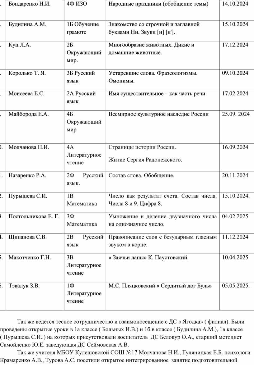 Так же учителя МБОУ Кулешовской СОШ №17 Молчанова Н.И., Гуляницкая Е.Б. психологи Крамаренко А.В., Турова А.С. посетили открытое интегрированное занятие подготовительной группы и концерт « 80 лет Победы» ДС « Ягодка» ( филиал), воспитатель Белокур О.А. на которых присутствовали старший методист Самойленко Ю.Е. заведующая ДС Сеймовская А.В.
